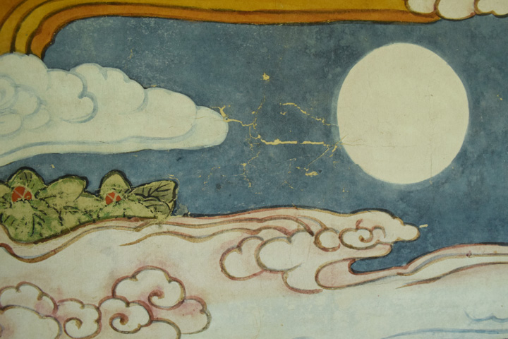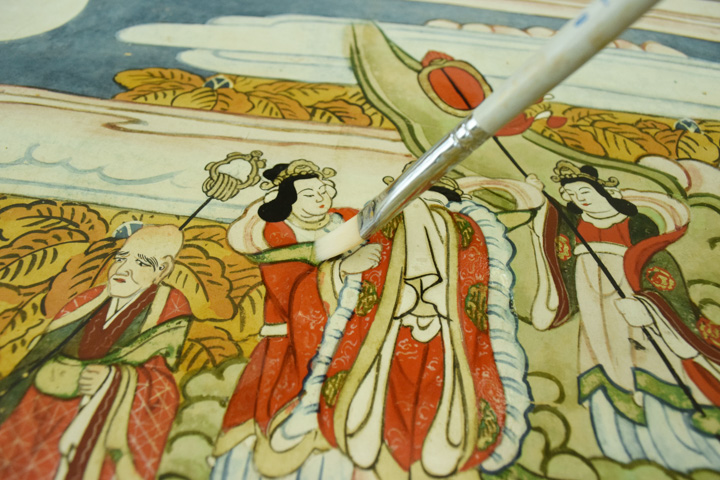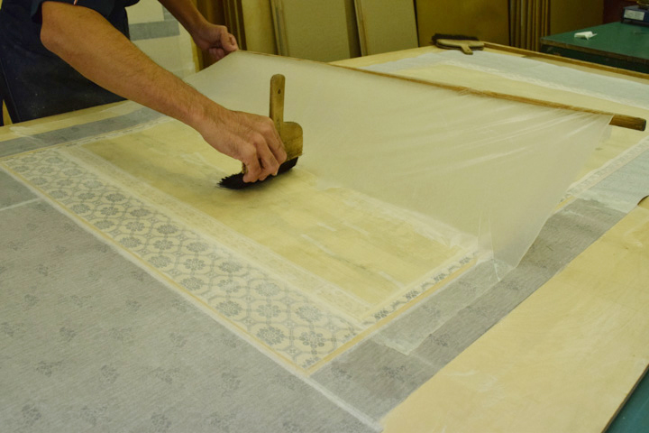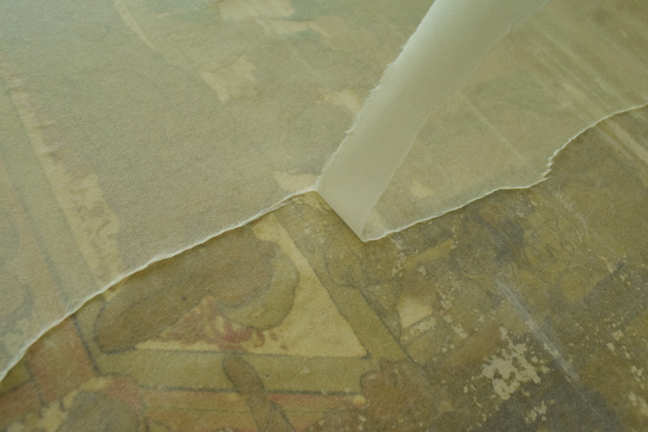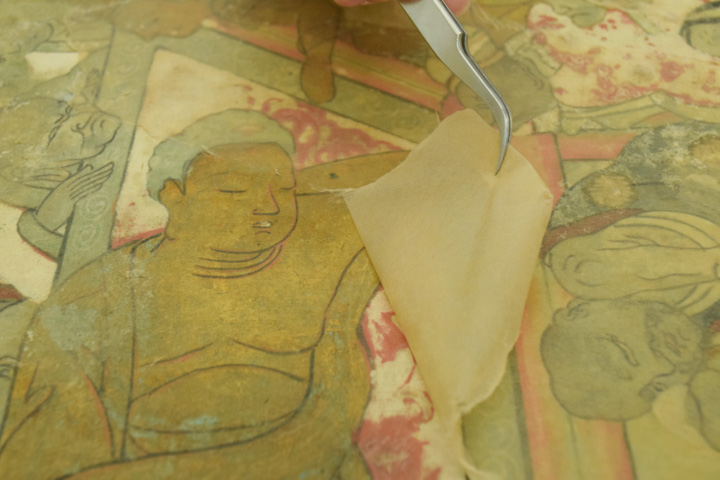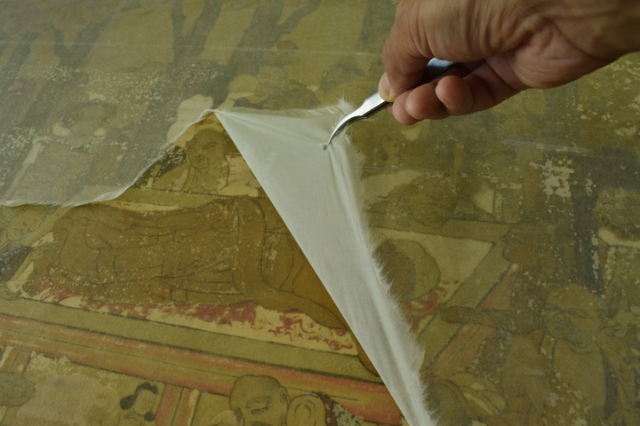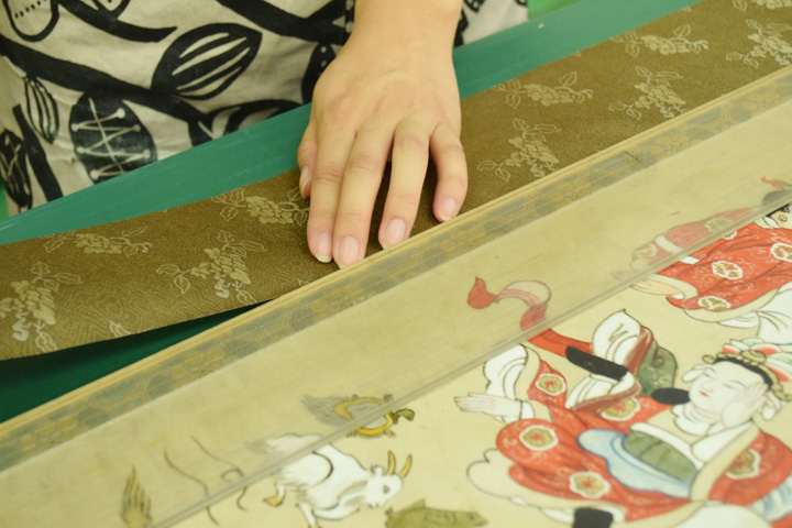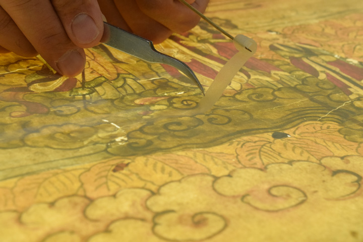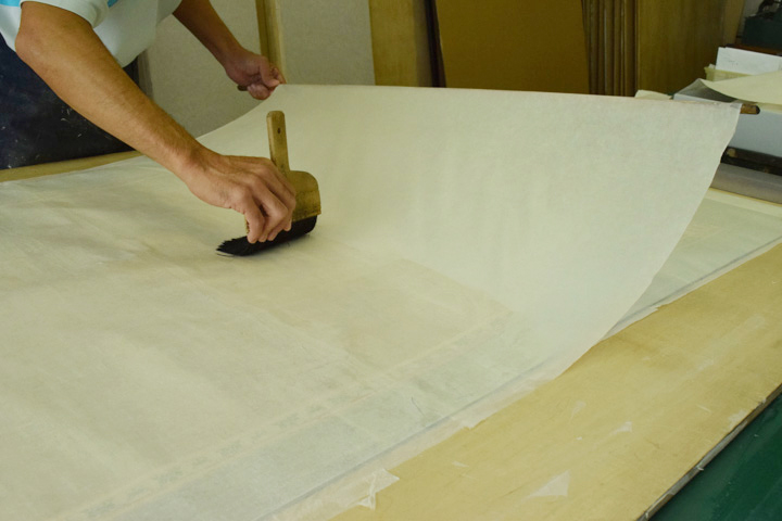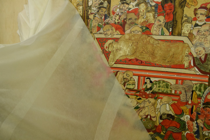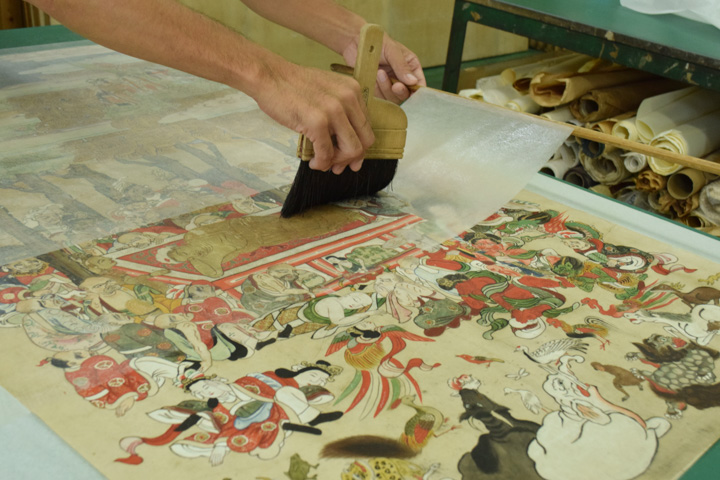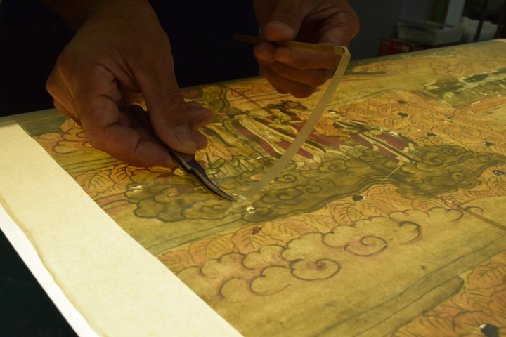 - 顔料・和紙が剥がれ落ちやすい状態のため養生用に表打ちを行った後、古い総裏・増裏・肌裏打ち紙を順番に除去し、新たに薄口の美濃紙にて本紙の肌裏打ちを行いました。その後表打ち紙を外して十分に乾燥させました。