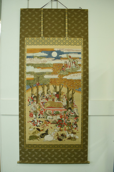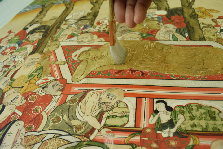 こちらは250年前から伝わる涅槃図の掛軸です。お釈迦様のお弟子であられる阿難陀尊者様が大変美男子に描かれており非常に気に入っておりましたが、開くとポロポロと紙が落ちてくる状態で、開くだけで怖い状態でしたので工房レストアさんに修復をお願いしました。これで安心して掛けることができ、喜ばしく思っております。今後は坐禅会等でお檀家さん・参禅者の皆様にこの涅槃図をご覧いただき、お釈迦様の姿をご説明していきたいと思っております。