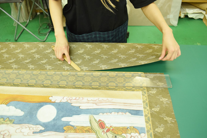 - 乾燥後、余分な和紙を断ち八双・軸木・風帯・紐を付け、検品後に写真撮影をし、納品いたしました。
